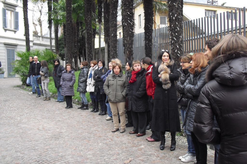 Una fila di persone che esce dagli uffici e si sistema ordinatamente nel parco di Villa Locatelli. È questa la scena vista da molte questa mattina, verso le 10, mentre transitavano nei pressi della stazione di Lecco.