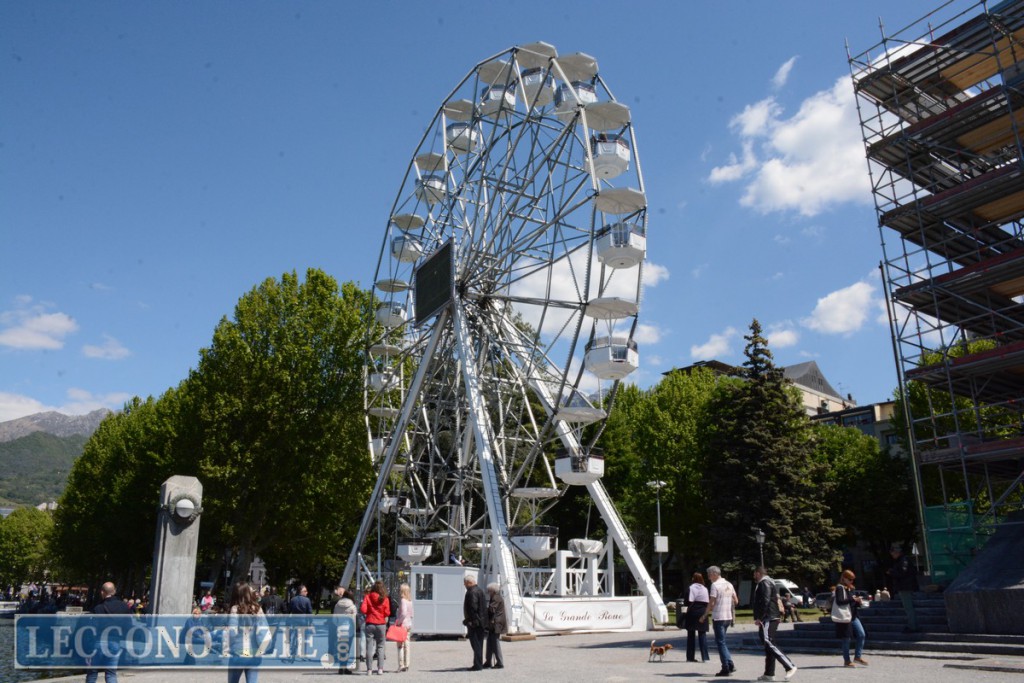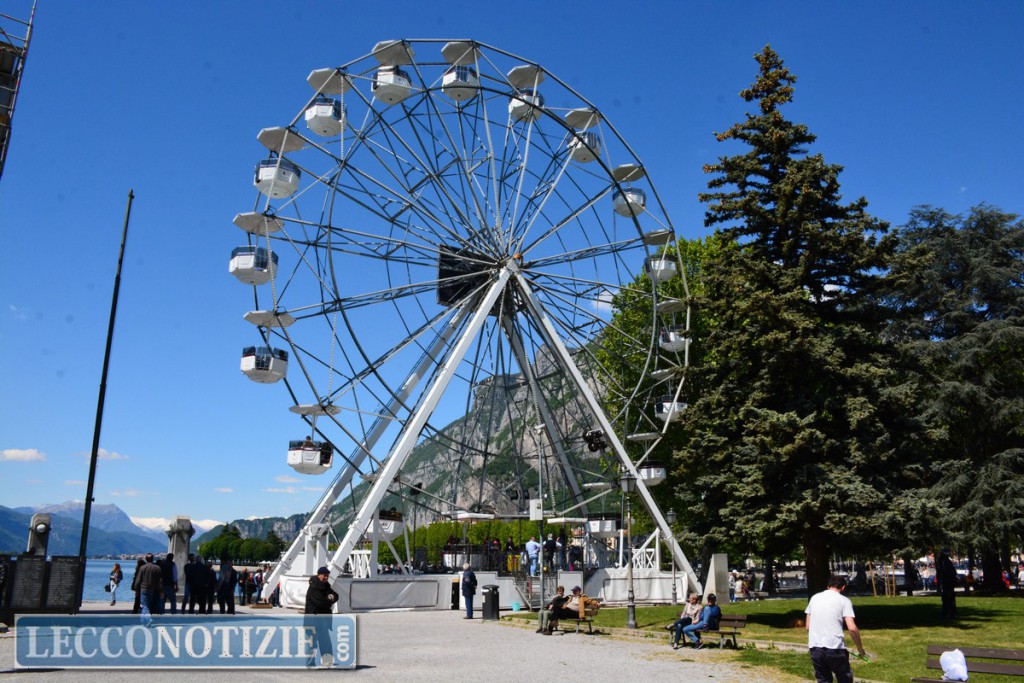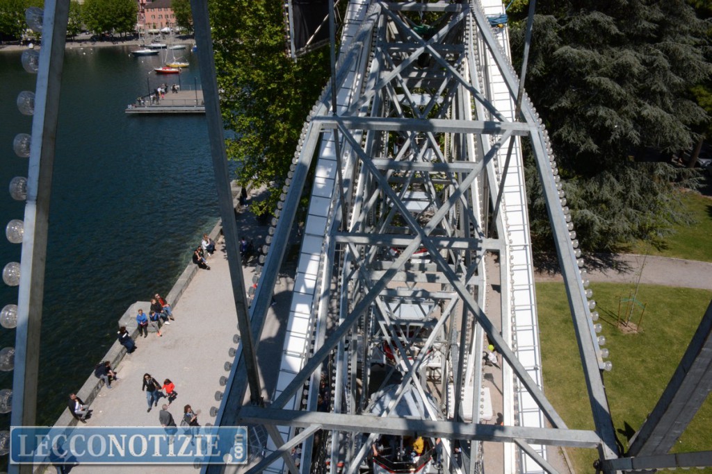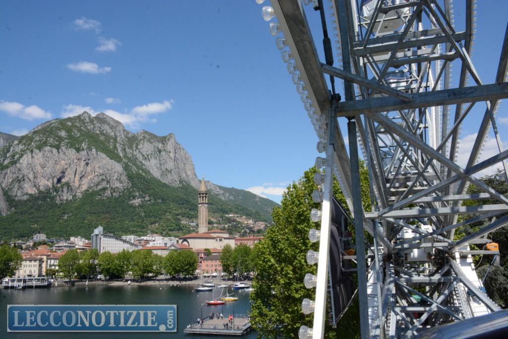LECCO – Su e giù per la grande giostra bianca, ammirando, dall’alto dei suoi trenta metri, il lago e le piazze storiche della città, il campanile e le montagne che abbracciano Lecco: la ruota panoramica ha aperto ufficialmente al pubblico sabato pomeriggio e in tanti non hanno voluto perdersi lo spettacolo, gratis per la prima ora.