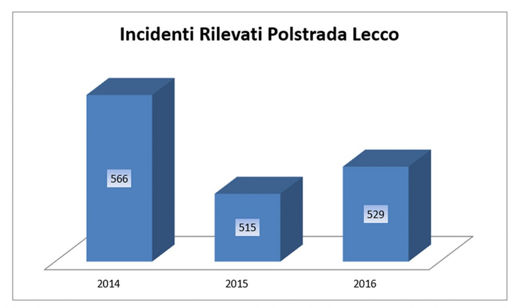 Nel lecchese, dopo un decremento continuo dell’incidentalità in questa Provincia, a far data dall’anno 2003 contraddistinto da 720 incidenti, l’anno 2014 è stato quello che ha manifestato una inversione di tendenza che si può ricondurre, secondo le forze dell’ordine, al fatto che si è trattato di un anno particolarmente piovoso. Predette condizioni meteo hanno contribuito al verificarsi di più incidenti, in particolare sulla strada statale SS36. Negli anni successivi (2015-2016) il trend si è ristabilizzato, con percentuali che rispecchiano i dati ISTAT Nazionali, con 515 incidenti nel 2015 e 529 nel 2016.