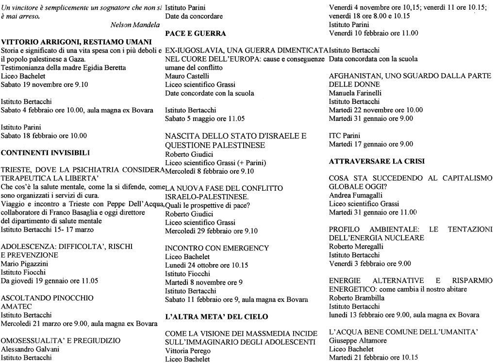 Entrando nel vivo sono nove la diverse macro-tematiche suggerite agli istituti scolastici da Continente Italia, ciascuna delle quali affrontata in modo diverso, a seconda dell’interesse dimostrato dagli insegnanti. Si va, quindi, dal percorso dedicato a Vittorio Arrigoni, rapito e ucciso lo scorso anno a Gaza, al tema della diversità, riguardante questioni quali la disabilità psichiatrica, i problemi adolescenziali e i pregiudizi su minoranze. Spazio, poi, al tema “Pace e Guerra”, con incontri sulla ex-Jugoslavia e sul conflitto medio-orientale. Il ruolo della donna, gli aspetti della crisi economica, emigrazione e immigrazione, legalità e reclusione rappresentano altri importanti filoni di approfondimento, cui si affiancano percorsi attraverso la Storia del secolo scorso e, infine, le diverse culture, raccontate attraverso musica e parole.