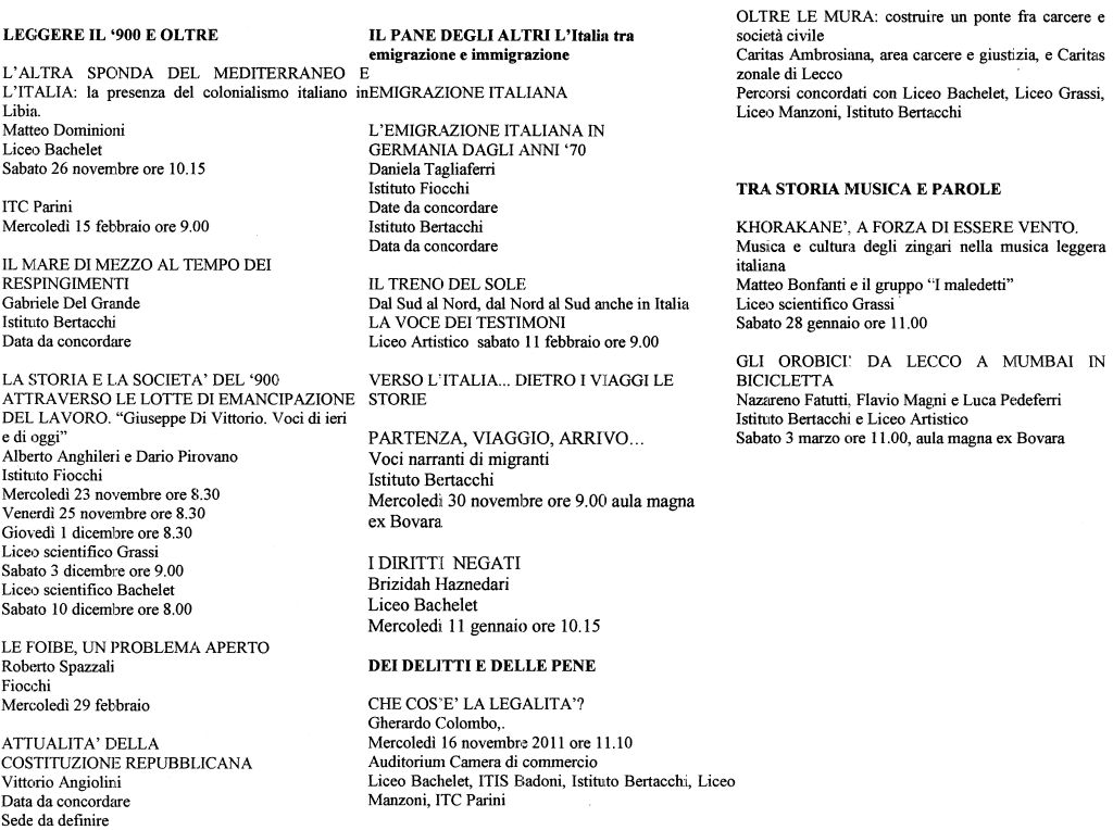Acli, Arci, Associazione Equosolidale Lecco, Associazione Italia Nicaragua, Associazione Senegalesi Lecco, Auser, Caritas decanale, Cgil sportello solidarietà, Circolo Amsicora, Comunità di via Gaggio, Crams, Legambiente, Rete Radiè Resch, Istituto Storico della Resistenza, Anpi, con la collaborazione di Amatec. Eccoli, quindi, i soggetti coinvolti, anche per quest’anno impegnati nel sostenere un progetto che non gode più di alcun aiuto economico da parte delle istituzioni locali. «Potremmo definirla un’iniziativa auto-finanziata – ha spiegato la coordinatrice Maria Andreotti – in quanto ogni associazione ha dato il suo contributo alla realizzazione. Importanti, poi, gli aiuti di Acel, della Cgil Spi e delle singole scuole che nel mese di ottobre hanno deciso di aderire a uno o più dei percorsi proposti».