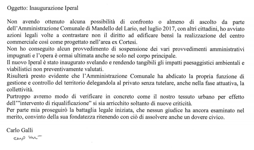 “Proseguirò la mia battaglia legale” annuncia Galli nelle lettera che pubblichiamo di seguito. Contro l’insediamento della catena commerciale erano stati avanzati ben cinque ricorsi al Tar e tre ricorsi civili, lo ha ricordato anche il presidente di Iperal, Antonio Tirelli, intervenendo nel corso dell’inaugurazione. “Mai in passato – ha ricordato Tirelli – una nostra iniziativa era stata contrastata così tanto come accaduto a Mandello”