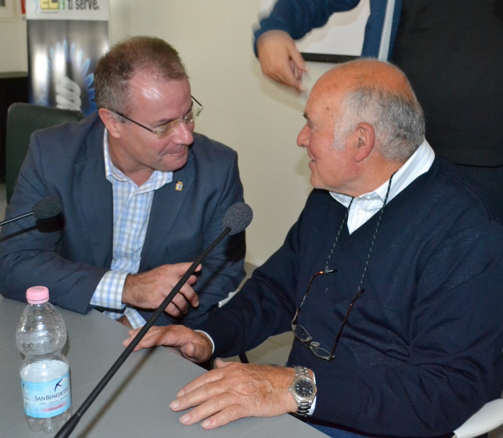Il sindaco di Lecco, Virginio Brivio, con Gigi Alippi il giorno della preentazione in città del libro "Il profumo delle mie montagne".
