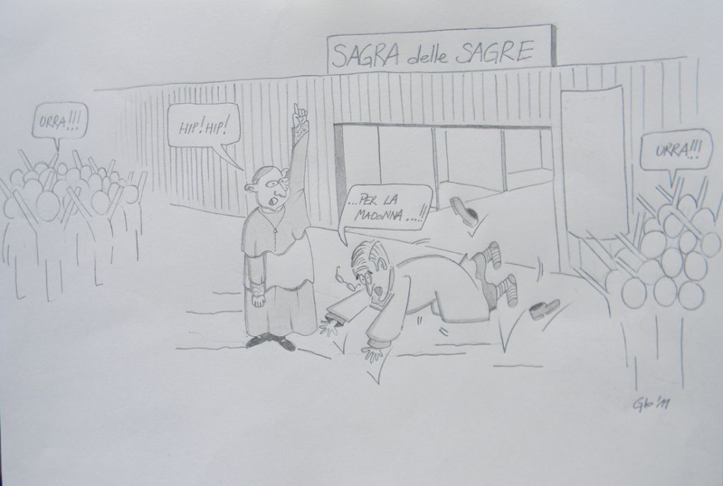 Nonostante non sia Gio’-vedì ecco una chicca ferragostana del giovane vignettista lecchese Gio’ che ci ha voluto omaggiare di una deliziosa vignetta: nelle sue grinfie è finita la caduta del cerimoniere del cardinale Dionigi Tettamanzi in visita alla Sagra delle Sagre.