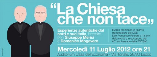 All’incontro di mercoledì saranno presenti monsignor Giuseppe Merisi, vescovo di Lodi e presidente di Caritas e monsignor Domenico Mogavero, vescovo di Mazara del Vallo; lo scopo dell’iniziativa è quello di ricordare a tutti che, in questo momento di crisi economica pieno di difficoltà, la chiesa c’è, fa sentire la sua presenza, attraverso le molteplici realtà che lavorano ogni giorno per fare del bene: “C’è una chiesa che non tace, che fa e che vuole richiamare i valori di Gesù superando stereotipi, confrontandosi nella ricerca della verità – spiega Rosa Scandella, presidente del Coe – L’incontro con due pastori della nostra chiesa rappresenterà sicuramente un’occasione preziosa per riflettere sulle sfide che ci attendono e che meritano l’impegno di tutti”.