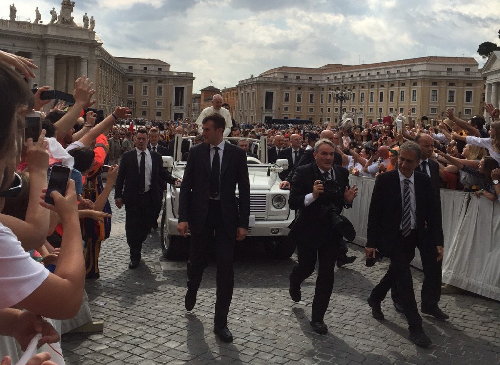 Al passaggio della papamobile i volontari hanno omaggiato il Pontefice consegnando una bandiera e una maglietta dell’associazione con la preghiera del volontario.