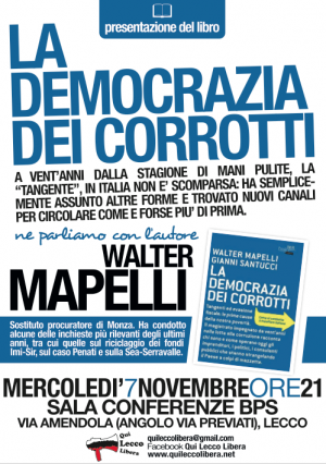 Questo è un passaggio de “La democrazia dei corrotti” (Bur), scritto a quattro mani dal giornalista del Corriere della Sera, Gianni Santucci, e dal sostituto procuratore di Monza, Walter Mapelli. Un contesto, quello della “democrazia dei corrotti”, dove gli “endemici vizi italiani del familismo e dell’economia delle relazioni hanno raggiunto livelli impressionanti”. Relazioni criminali, dove la bustarella di vent’anni fa ha ceduto il passo al conflitto d’interessi o generose regalie.