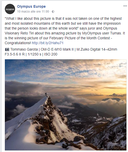 Tommi non è certo nuovo alla realizzazione di scatti fantastici e molto apprezzati dal pubblico, ma è la prima volta che riceve un così importante riconoscimento, e pure a livello Europeo. Ed affida così a Facebook la sua soddisfazione: “quando mi hanno contattato per dirmi che avevo vinto il primo premio per il concorso a livello Europeo Olympus Europe per la foto del mese di Febbraio “Sulla vetta del mondo” non ci credevo e ho risposto “ma va valaaa!” … invece è tutto vero e non ci credo ancora!”.