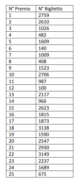 In serata si è svolta anche l’estrazione di premi della lotteria organizzata in concomitanza della manifestazione, di seguito la lista dei biglietti vincenti. I premi potranno essere ritirati fino al 28 febbraio contattando il numero 3486552584.