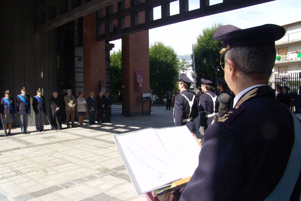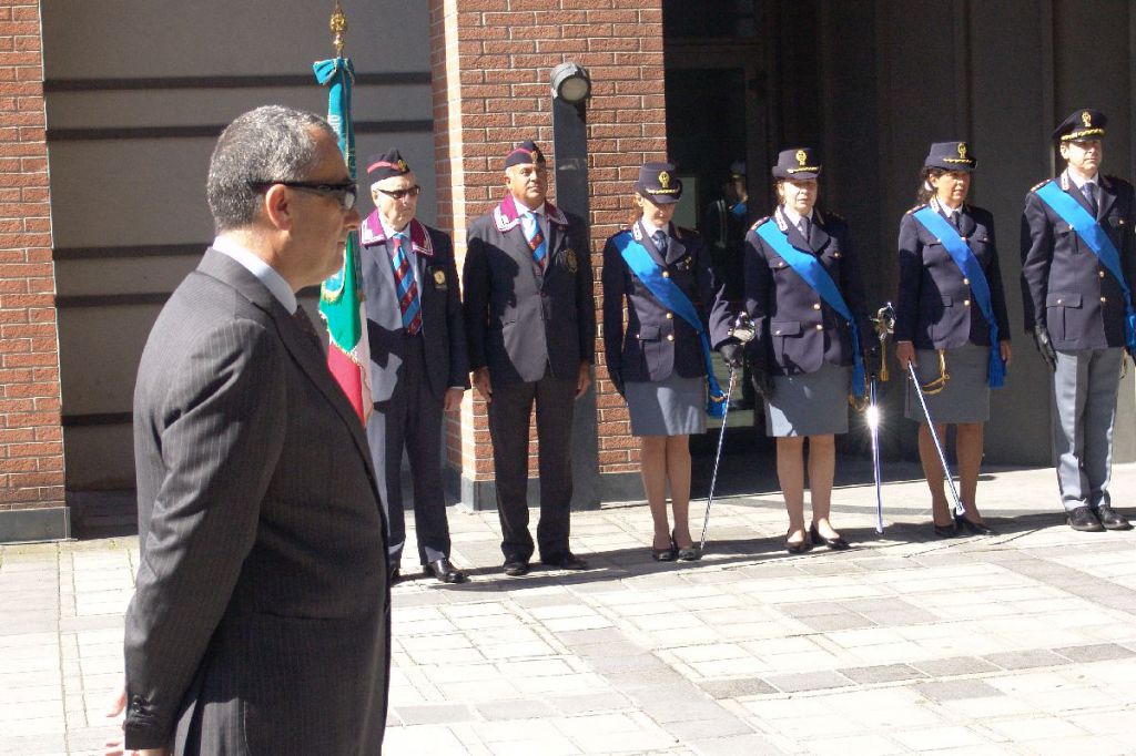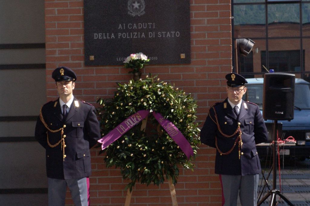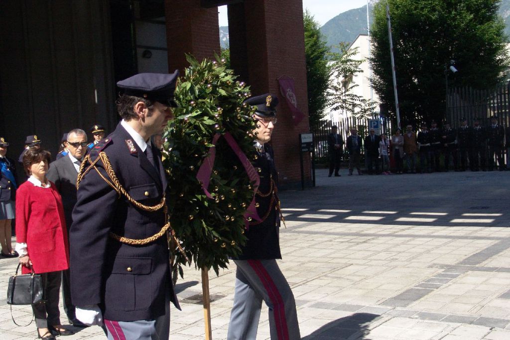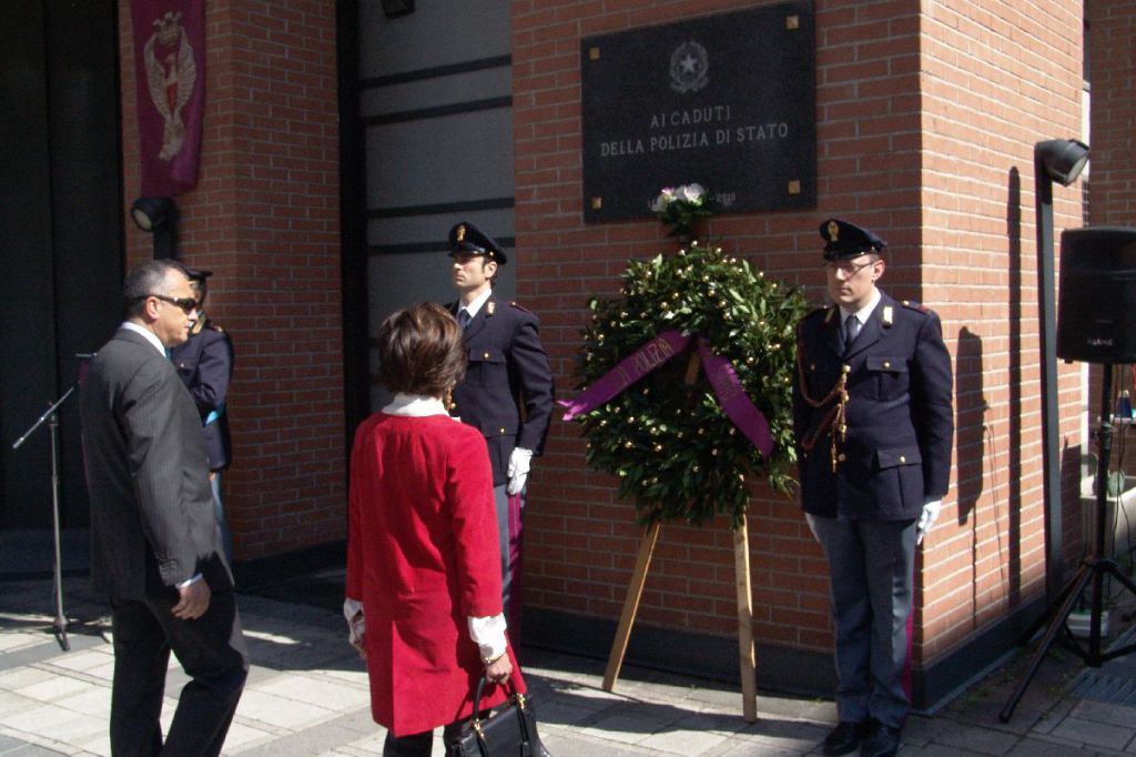 Intorno alle 10, nella corte interna della Questura, si è sono tenuta la prima parte della mattinata di celebrazioni con gli onori ai caduti, alla presenza del questore Francini e del prefetto Antonia Bellomo, con la deposizione della corona di fiori in ricordo di tutti gli agenti scomparsi durante il loro servizio.