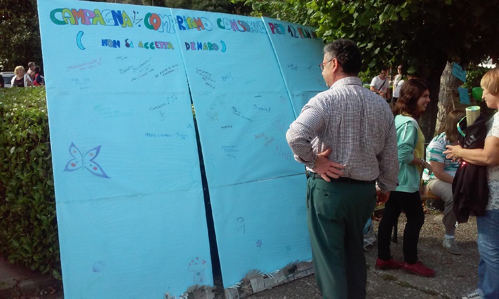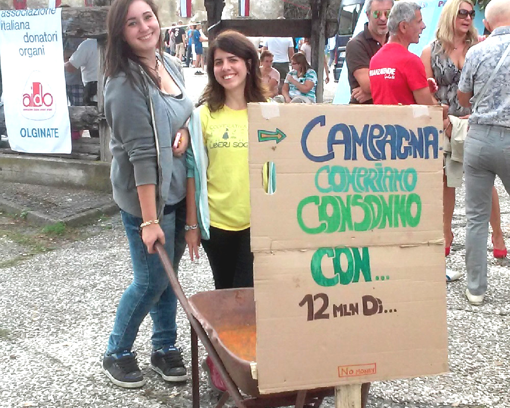 “Compriamo Consonno con 12 milioni di… Non si accetta denaro” recita il cartello. La gente inizialmente è è sembrata un po’ intimorita poi, appena si è accorta che non si chiedevano soldi, si è sciolta in un sorriso e sono arrivate le offerte dalle più fantasiose, alle romantiche, dalle pragmatiche a quelle un po’ matte.