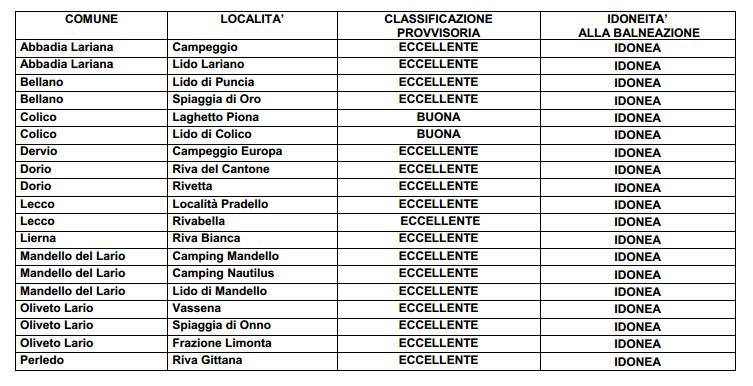 LECCO – Acqua pulita, pollice alzato per tutte le località balneari lacustri del comprensorio lecchese di seguito elencate.