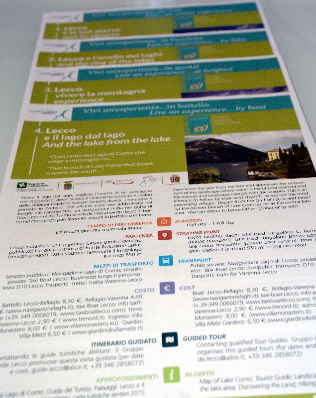 “Lecco vivere la montagna” è la terza scheda che offre invece al visitatore indicazioni utili sui sentieri e i percorsi che da Erna portano verso il Resegone, segnandone i rifugi e il grado di difficoltà. Infine, “Lecco e il lago visto dal lago”, un itinerario in battello che dal golfo di Lecco porterà il turista verso le ville storiche della riviera. Le schede saranno disponibili all’ufficio di accoglienza turistica e saranno distribuite a tutti gli operatori del settore, agenzie viaggio comprese.