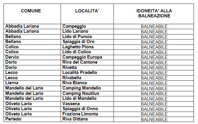 Il risultato vale sia per le località poste sul ramo lecchese del lago di Como sia per la località molo Pre Campel di Bosisio Parini e la Punta del corno di Rogeno, sul lago di Pusiano, analisi in questo caso effettuate in collaborazione con il Servizio Igiene e Sanità Pubblica dell’A.S.L. di Como ed il Laboratorio di Prevenzione del Dipartimento di Prevenzione Medica.