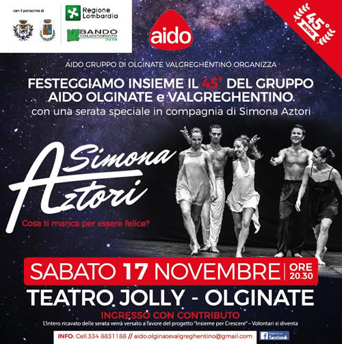 Sabato 17 novembre al teatro Jolly di Olginate, ore 20.30, sarà protagonista Simona Atzori. Nata a Milano nel 1974, pur essendo priva delle braccia ha intrapreso con successo l’attività di ballerina classica, pittrice e scrittrice.