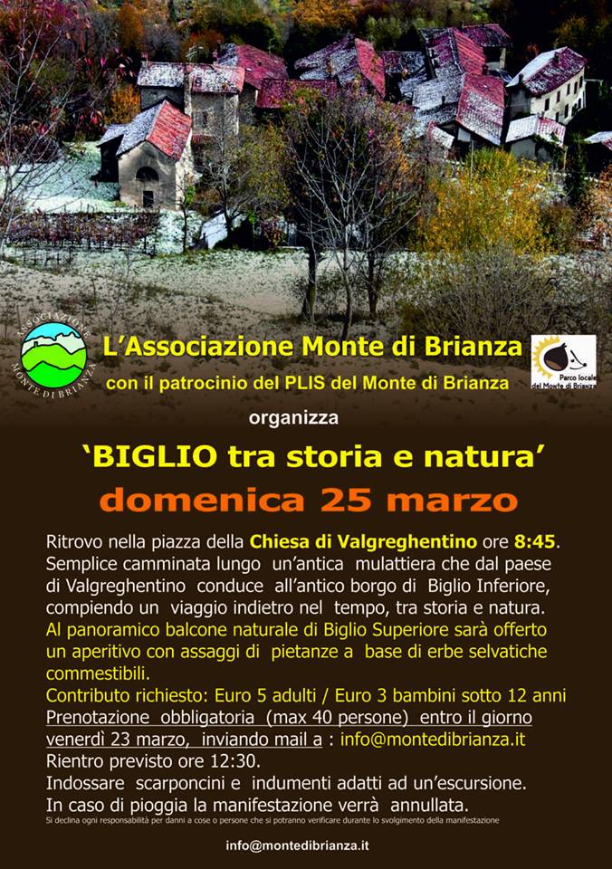 VALGREGHENTINO – L’associazione Monte di Brianza organizza per domenica 25 marzo, con il patrocinio del Plis del Monte di Brianza, “Biglio tra storia e natura”, un’escursione sul balcone panoramico della frazione di Biglio.