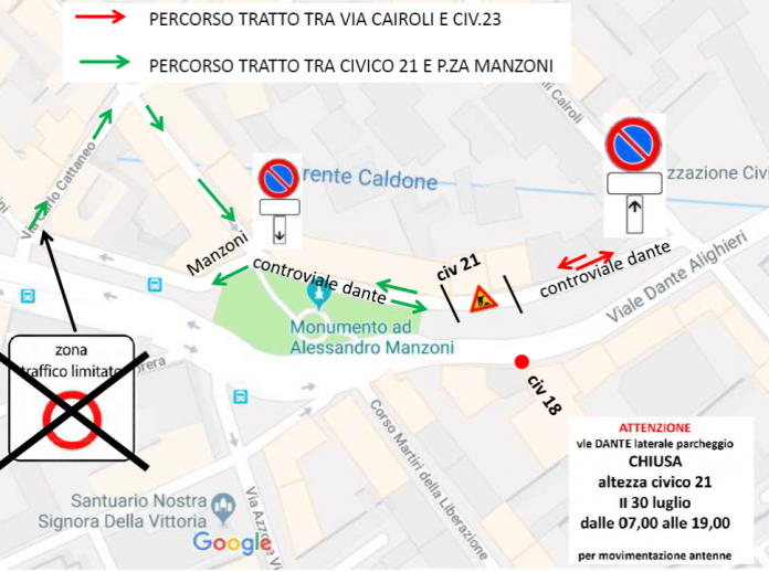 Per veicoli commerciali e quelli diretti alle proprietà laterali del tratto di controviale di viale Dante compreso tra il civico 21 e piazza Manzoni, del tratto di piazza Manzoni compreso tra il civico 1 e il civico 15 e del tratto di via Roma, compreso tra piazza Manzoni e via Carlo Cattaneo è revocato il senso unico di marcia nel tratto di controviale di viale Dante compreso tra il civico 21 e piazza Manzoni e nel tratto di piazza Manzoni compreso tra il civico 1 e il civico 15.