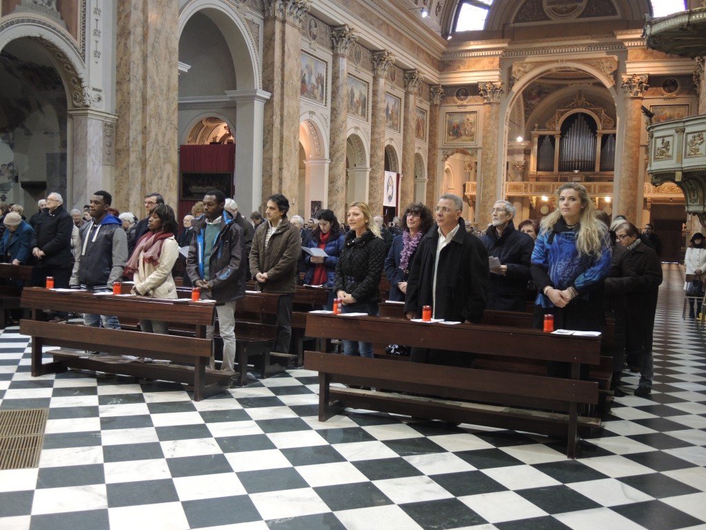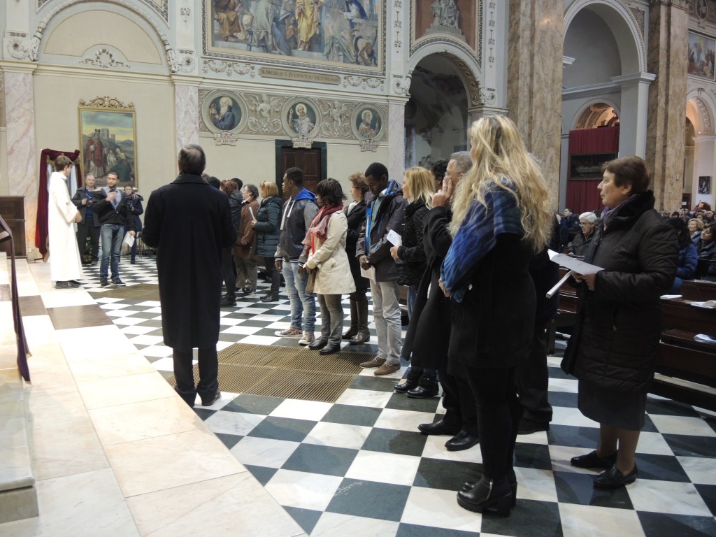 Con queste parole il Vicario Episcopale di Zona Mons. Maurizio Rolla si è rivolto agli 11 catecumeni adulti che questa mattina, durante la Messa delle 11.30 in Basilica San Nicolò, sono stati accolti dalle proprie comunità e ammessi a ricevere i sacramenti cristiani attraverso il rito dell'”Iscrizione del nome”. Un cammino, quello dei catecumeni, che durerà per tutto il periodo della Quaresima fino alla Pasqua. “Avete accolto Dio nella vostra esistenza e attraverso la conversione la vostra natura deve diventare capace di esprimersi come dono del Signore” ha proseguito Mons. Rolla, assistito durante la celebrazione dal prevosto di Lecco Mons. Franco Cecchin, il responsabile della zona 3° per il catecumenato degli adulti Don Antonello Rossi, il parroco di Introbio Don Marco Mauri e il diacono Lucio Piterà.