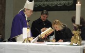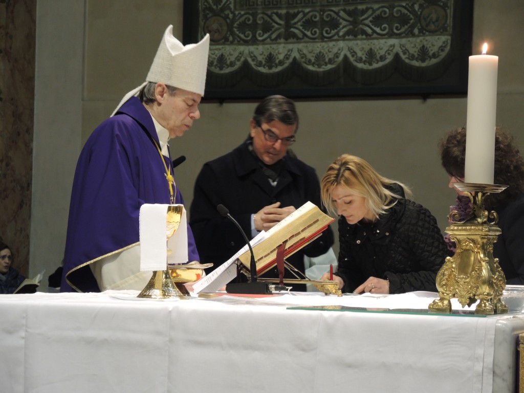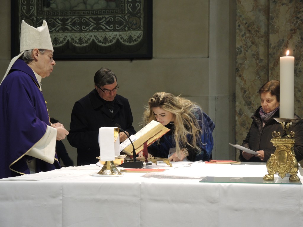 Durante la Santa Messa, la prima della Quaresima, gli undici catecumenti, provenienti da Albania, Costa d’Avorio, Tunisia e Camerun, accompagnati dai loro padrini sono stati ammessi, in merito ai loro impegni e doveri come credenti, alle proprie comunità di appartenenza – Robbiate, Costa Masnaga, Valmadrera, Lecco e Introbio – firmando il foglio che andrà a costituire un vero e proprio libro insieme con le altre 150 firme dei catecumeni delle Diocesi che oggi hanno compiuto lo stesso gesto. Il “libro degli eletti”, come ricordato, sarà controfirmato dal Cardinale Angelo Scola.