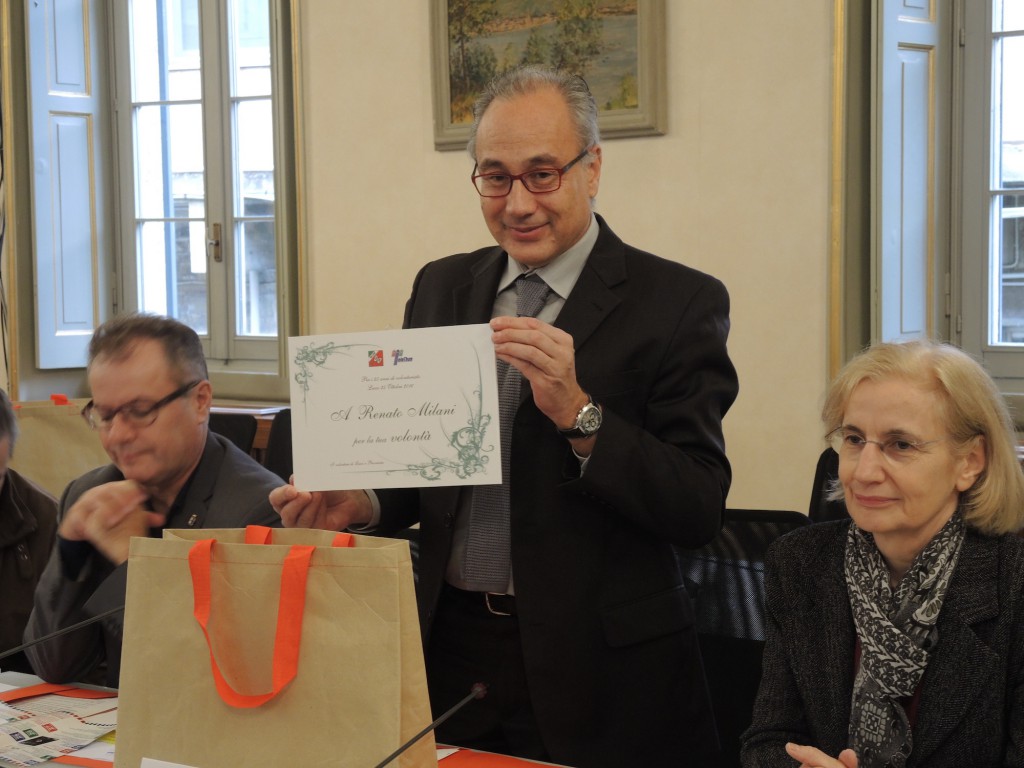La piccola cerimonia si è aperta con alcune premiazioni “d’obbligo”, a quattro personaggi definiti “anima e cuore” del Coordinamento Provinciale lecchese di Telethon: il presidente Renato Milano, il socio fondatore Uildm Angelo Fontana, il presidente Uildm Gerolamo Fontana e Roberto Maggi, consulente scientifico.