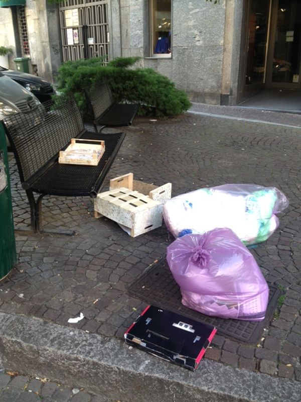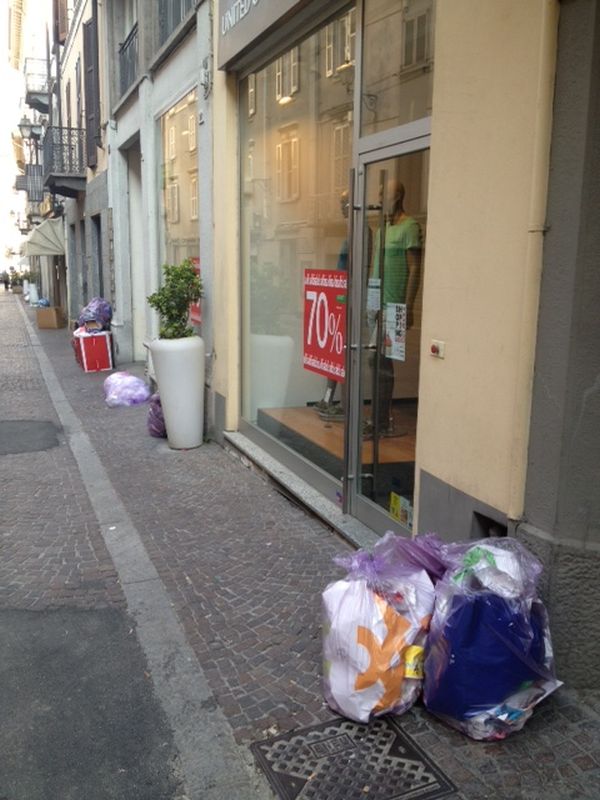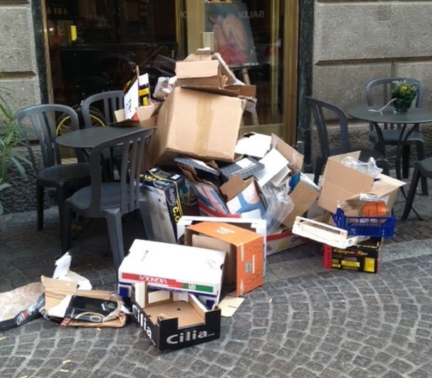 LECCO – Chi oggi, venerdì 18 luglio, ha avuto il dispiacere di avventurarsi a Lecco di prima mattina si è trovato di fronte una situazione davvero incresciosa. Nelle centralissime via Cavour e via Roma c’erano sacchi dell’immondizia ovunque, cartoni abbandonati davanti ai negozi, sporcizia in ogni angolo e in strada. Fino a dopo le 9 questa è stata la fotografia che hanno avuto i cittadini ma anche i visitatori o i lavoratori che sono arrivati in centro.