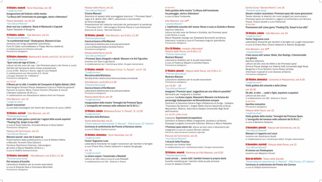 Come ogni anno, il 14 ottobre prende il via il più importante appuntamento culturale dedicato alla valorizzazione del patrimonio manzoniano: la rassegna “Lecco città dei Promessi Sposi”. La nuova edizione ha in riserbo decine di eventi destinati a ogni tipo di pubblico, dagli appassionati alle famiglie, dagli studenti delle scuole di ogni ordine e grado ai giovani interessati alle manifestazioni della creatività, dagli insegnanti agli studenti fino a coinvolgere un gruppo di alunni delle scuole primarie.