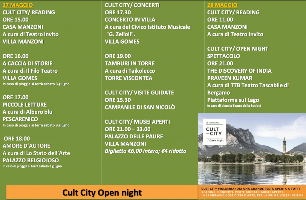 È questo il cartellone di eventi previsti per sabato 27 e domenica 28 maggio presentato mercoledì mattina presso Palazzo delle Paure a Lecco e inserito nell’iniziativa regionale “Cult City Open Night”: una grande rande festa diffusa sul territorio lombardo, con concerti, reading, spettacoli, visite guidate, aperture straordinarie di musei, teatri e negozi. Un fitto programma di eventi realizzati dagli 11 capoluoghi di provincia, in collaborazione con Regione Lombardia, inLombardia e Unioncamere Lombardia, nell’ambito del progetto di valorizzazione e promozione turistica delle città d’arte ‘Cult City’ promosso dall’assessorato allo Sviluppo economico attraverso la DMO regionale Explora.