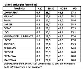 La provincia lombarda in cui vi è la maggiore percentuale di patentati con meno di 20 anni è Sondrio (1,7%), Lecco è al secondo posto (1,1%) seguita da Bergamo (0,9%), Varese, Como e Brescia (0,8%), Pavia, Cremona e Mantova (0,7%), Monza e Brianza (0,6%), Lodi (0,5%) e Milano (0,4%).