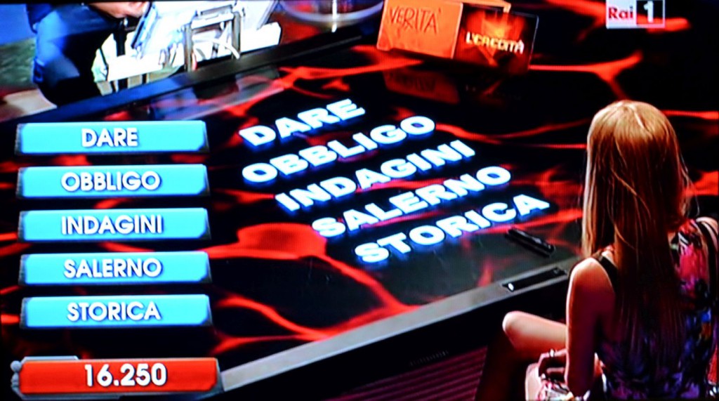 Arianna, che frequenta l’Università a Bergamo Alta e che era accompagnata da sua madre Tiziana, ha scritto sulla lavagnetta “verità”, mentre la parola da indovinare (che si legava a “dare”, “obbligo”, “indagini”, “Salerno” e “storica”) era “svolta”.