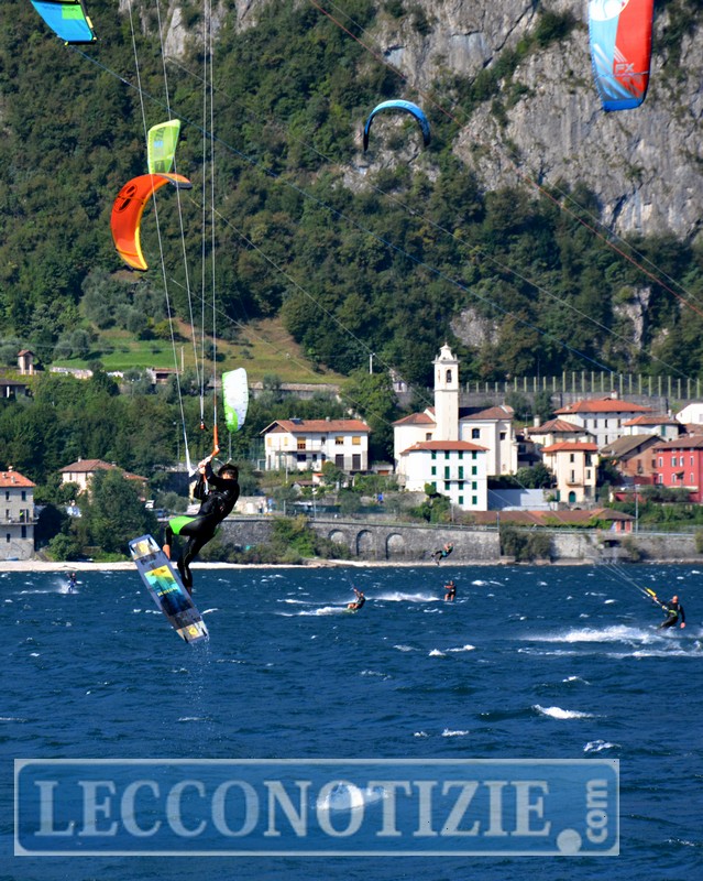 Tantissimi, tavola ai piedi e vela in cielo, hanno colorato il già suggestivo scenario offerto dal Lario sfruttando il forte vento che soffiava deciso nella prima mattinata. “E’ il Vento del Nord, siamo intorno ai 20, 25 nodi” ci dice un appassionato prima di lanciarsi tra onde.