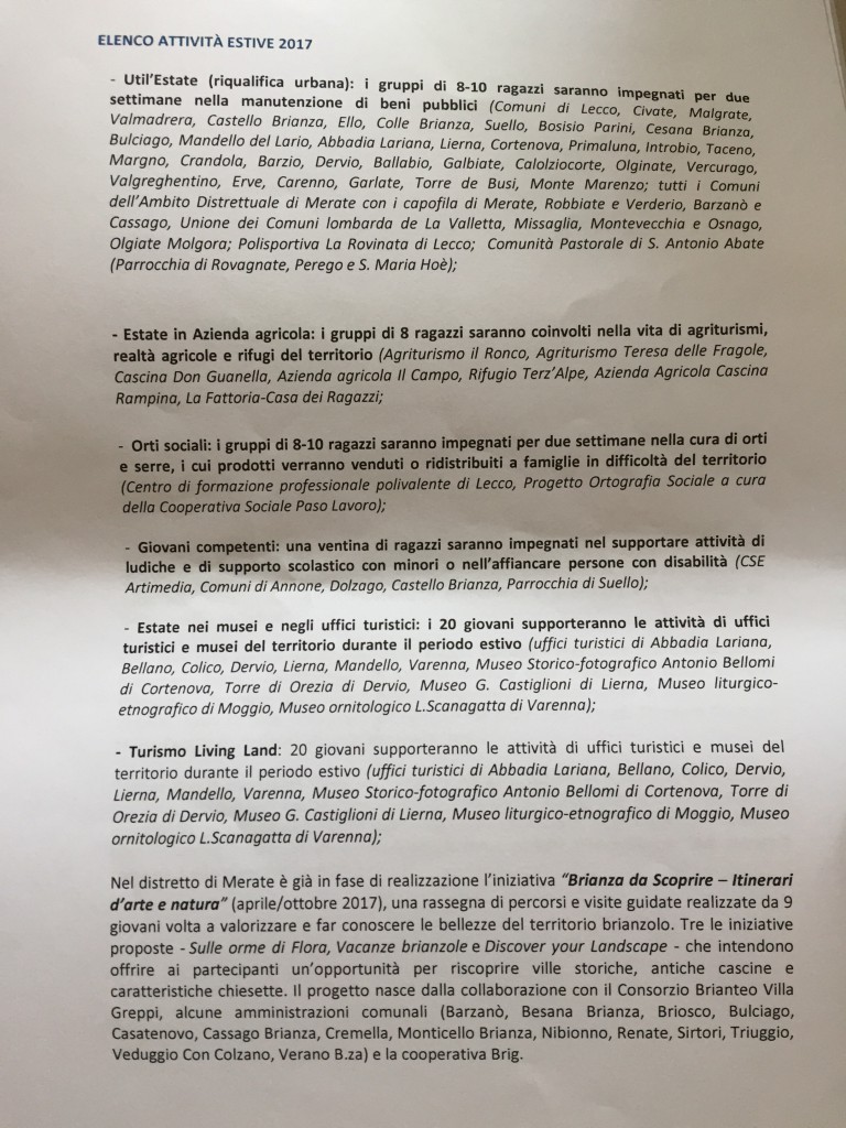 Le attività dell’estate 2017 sono state presentate questa mattina, giovedì, presso la Sala Consiliare della Provincia alla presenza dei referenti Marco Faggiano e Eleonora Cortesi, del Presidente del Distretto di Lecco e sindaco di Casatenovo Filippo Galbiati, della Coordinatrice del Sistema Museale della Provincia di Lecco Annamaria Ranzi e del Consigliere del Consorzio Brianteo Villa Greppi Lucia Urbano.