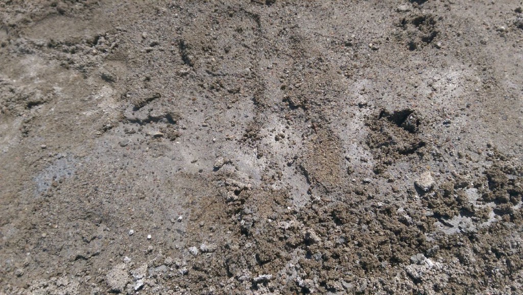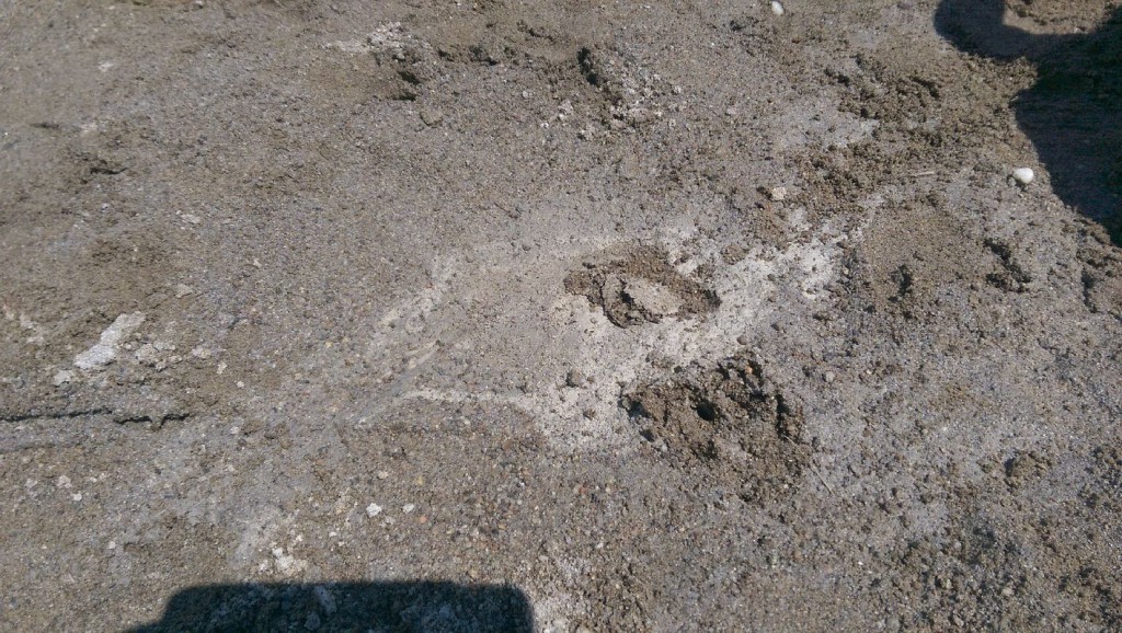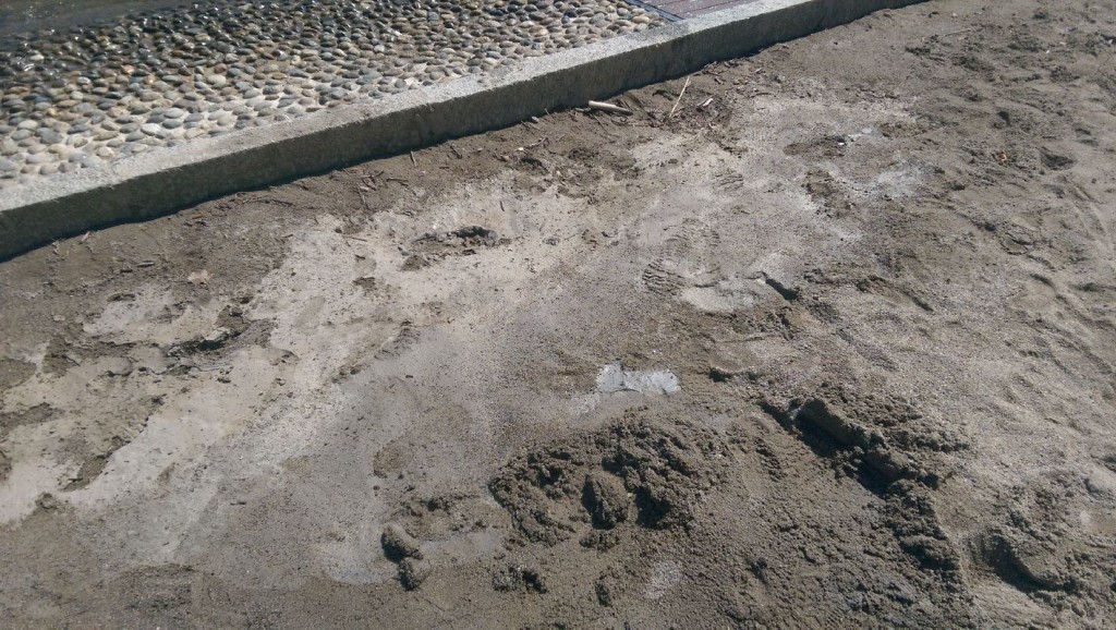 Mio malgrado ho trovato dei residui di cemento o sostanze cementizie, sembra che qualcuno ha pulito secchi o peggio carriole sporchi di cemento e i resti li ha buttati sulla spiaggetta dove vanno a giocare i bambini.