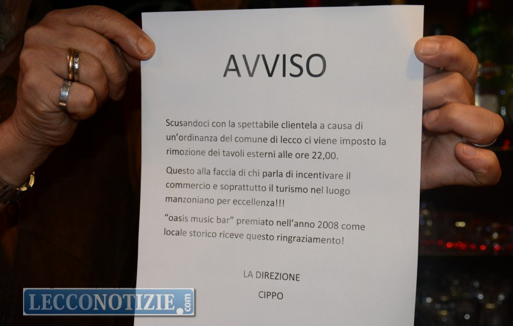 Nel luogo manzoniano per eccellenza mi vengono imposte restrizioni alla gestione dell’occupazione esterna di suolo pubblico, per la quale verso al Comune 1200 euro annui, costringendomi a ritirare i tavoli (quattro) e sedie (sette) alle ore 22 di sera, al contrario di quanto accade altrove. Alla faccia del turismo!
