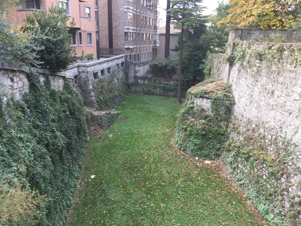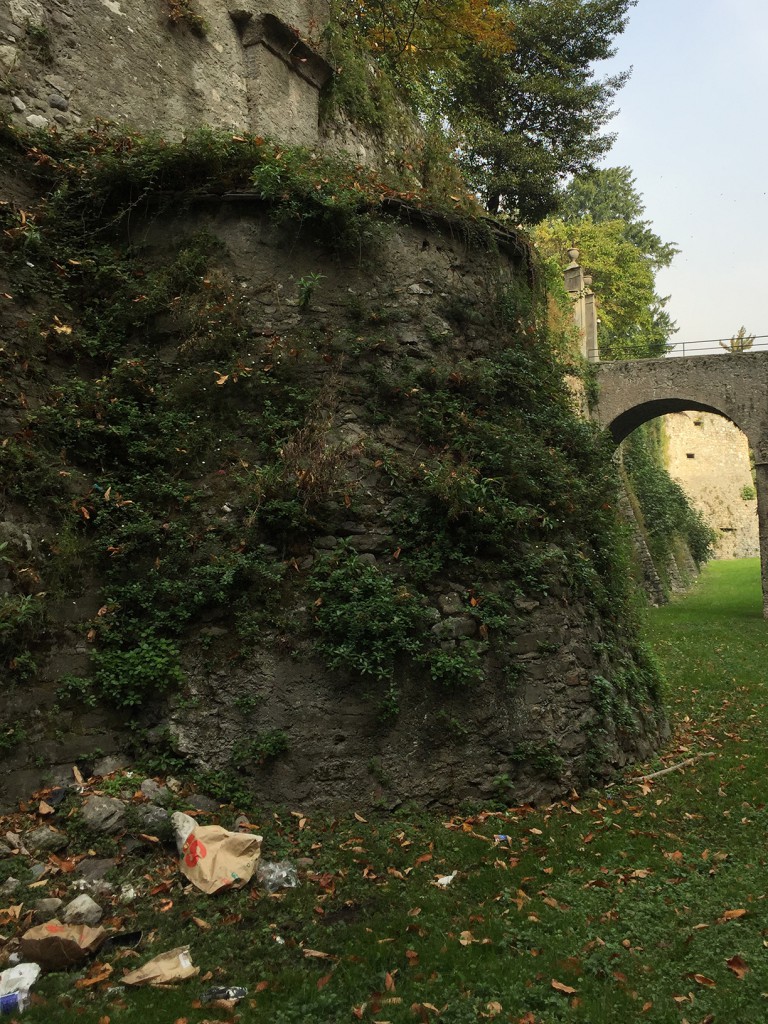 Vengo accolto da un cartello informativo abbastanza interessante che riassume la storia delle mura. Peccato che la traduzione in inglese per i turisti stranieri sia stata ridotta a 4 righe striminzite, decisamente riduttivo per una città che punta anche sul turismo. Comunque, la prima cosa che noto è il pessimo stato della scaletta che scende verso il fossato, in molti punti arrugginita e con l’ultimo gradino rotto. Appena sceso di livello ho la sensazione di essere in un’altra epoca e provo ad immaginare quante cose siano successe lì sotto nei secoli, tra invasioni, frecce lanciate dalle feritoie, cannonate, peste. Il profumo di storia inizia a dissolversi quando noto lo stato delle mura: nonostante siano state ripulite dai Ragni di Lecco appena due anni fa, piante rampicanti e sterpaglie le ricoprono in parte, segno che quella occasionale pulizia andrebbe fatta più spesso in un luogo così importante. Ma sorvoliamo….