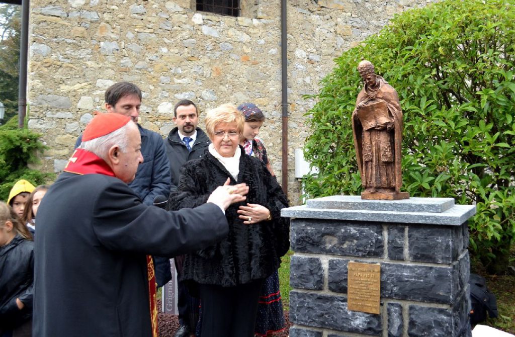 Successivamente nel piccolo parco intitolato allo scultore Michele Vedani, a sua volta assiduo frequentatore di Esino Lario, è stato scoperto e benedetto dal cardinale Tettamanzi il monumento dedicato a Pio XI, fusione in bronzo ricavata dal bozzetto in gesso eseguito nel 1936 proprio dal maestro Vedani (da questa stessa scultura è stata riprodotta la statua in marmo di Papa Ratti custodita nel Duomo di Milano). L’inaugurazione è stata preceduta dagli interventi del sindaco Giovanni Dell’Era (“quello del futuro Papa Pio XI è stato un legame indissolubile con Esino e con il nostro territorio”), del sottosegretario regionale all’Expo 2015 Fabrizio Sala (“è importante lanciare messaggi storici e culturali e in tal senso un monumento qual è quello che Esino inaugura in questo parco serve a lasciare a chi verrà un segno tangibile”) e di Giovanna Barindelli. Poi una foto ricordo e il congedo, sotto una leggera pioggia e con la banda di Esino che eseguiva il “Signore delle cime”.