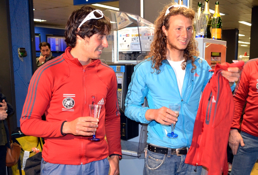LINATE – Qualcuno si è persino spaventato ieri sera uscendo dal gate dell’aereoporto di Linate, facendo due passi a ritroso dopo essersi ritrovato davanti a un centinaio di persone felicemente chiassose e pronte a far la “ola”… La festa griffata Ragni Lecco dalla palestra di arrampicata di via Carlo Mauri si è infatti spostata all’aereporto milanese in attesa dell’arrivo dalla Patagonia di Matteo Della Bordella (Ragno) e Luca Schiera artefici della salita alla Torre Egger dall’inviolata parete Ovest, tracciando la via inizialmente battezzata “Die Another Day” (morire un altro giorno) poi ribattezzata “Notti Magiche”. Un’impresa storica con la quale i due giovani alpinisti, con il contributo fondamentale di Matteo Bernasconi costretto anzitempo al rientro per motivi di lavoro, hanno scritto una nuova pagina di alpinismo.