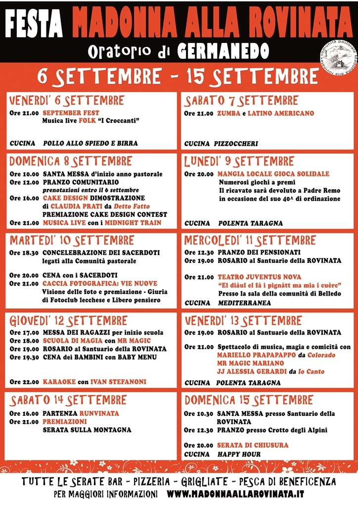 Domenica 15 grande finale religioso: ricorre infatti la Festa del Santuario della Madonna della Rovinata patrona della Comunità, con la Messa al Santuario, pranzo al Crotto degli Alpini e grande serata di chiusura a Germanedo.