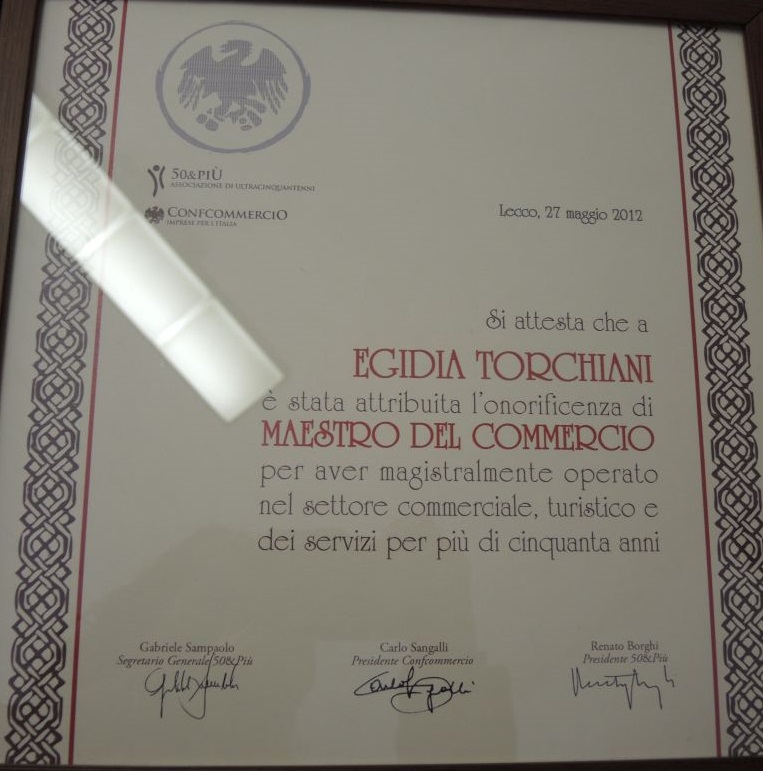 Per il lavoro svolto con passione e dedizione Egidia ha ricevuto diversi premi e riconoscimenti nel corso degli anni, di cui l’ultimo nel 2012 quando Confcommercio e l’Associazione 50&più le hanno assegnato l’onorificenza di Maestro del Commercio.