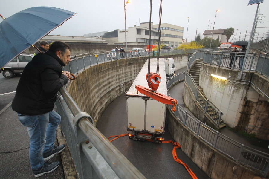 LECCO – Quasi un’ora di lavoro per i Vigili del Fuoco di Lecco prima di riuscire a sbloccare l’autoarticolato che si è incastrato nel sottopasso di Maggianico in via al Lago che supera la ferrovia e unisce le via Brodolini a vicolo Gomes.