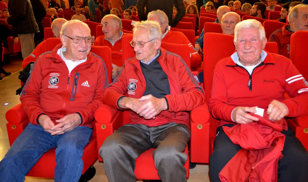 Quindi un applauso per altri due grandi Ragni seduti in prima fila: Luigino Airoldi e Romano Perego. Poi tutti sul palco per una storica foto di gruppo, ultimo atto della serata con i “maglioni rossi”.