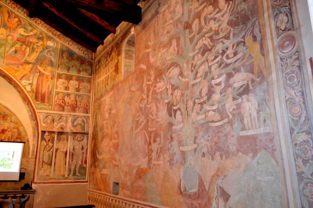 “Il solo vederli ce li fa apprezzare – ha premesso – considerato tra l’altro che si tratta di affreschi con caratteristiche diverse uno dall’altro”. “Siamo nel XV secolo – ha spiegato – e sulle pareti si osservano da un lato la schiera dei beati del Paradiso, la progressiva ascesa appunto verso la gloria celeste delle anime del Purgatorio e le sette opere di misericordia. Sulla parete frontale sono raffigurati l’Inferno, con l’albero dei dannati, e i sette vizi capitali”.