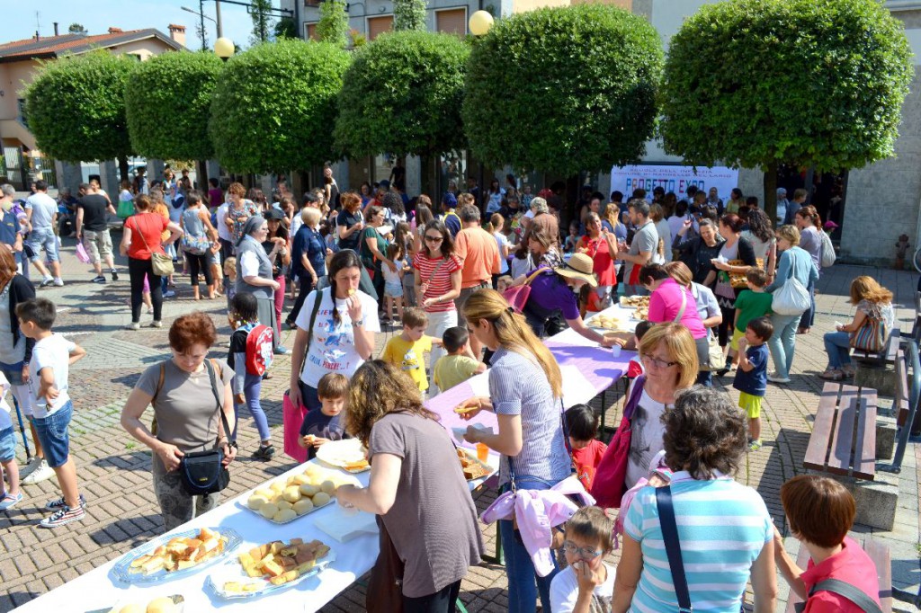 Le tavolate allestite in piazza Leonardo da Vinci a conclusione del “progetto pane” realizzato con i bimbi delle scuole dell’infanzia di Mandello.