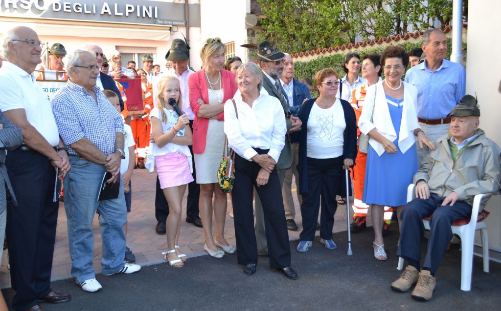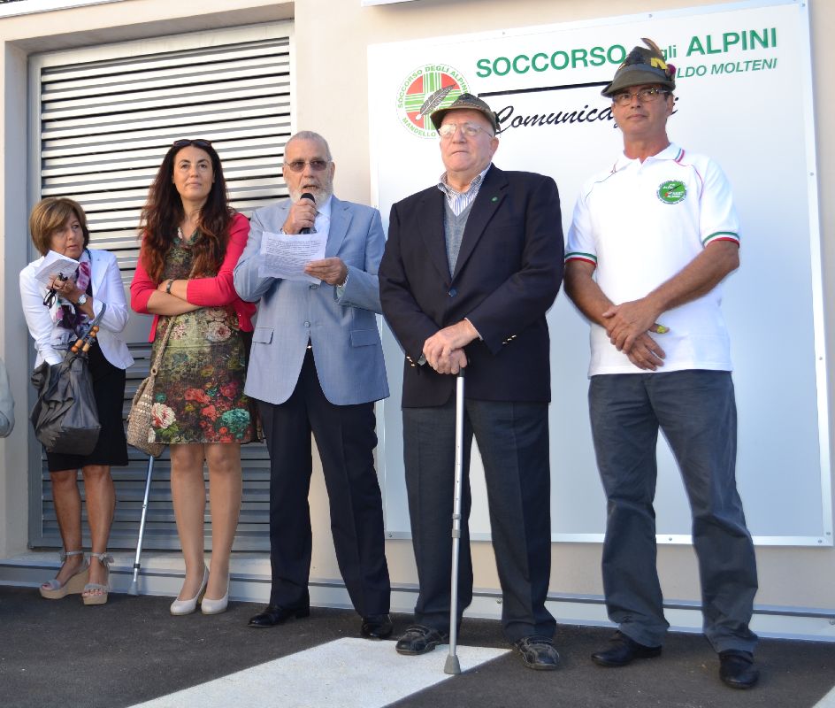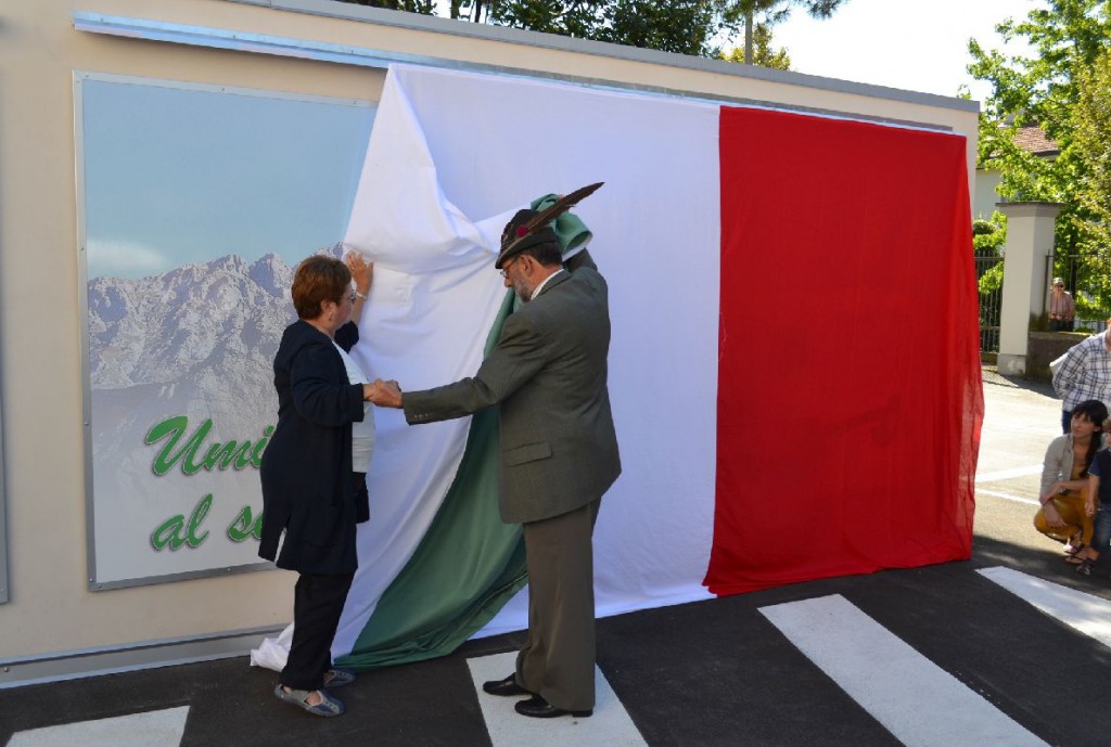 L’alzabandiera e l’inno di Mameli hanno preceduto lo scoprimento da parte di Graziana Panizza e Armando Locatelli del pannello realizzato all’esterno della sede e fino a quel momento nascosto da una grande bandiera tricolore.