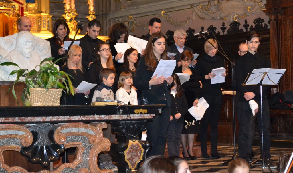 Il coro che ha accompagnato le esecuzioni dell’orchestra giovedì 26 marzo nella chiesa arcipretale di San Lorenzo.