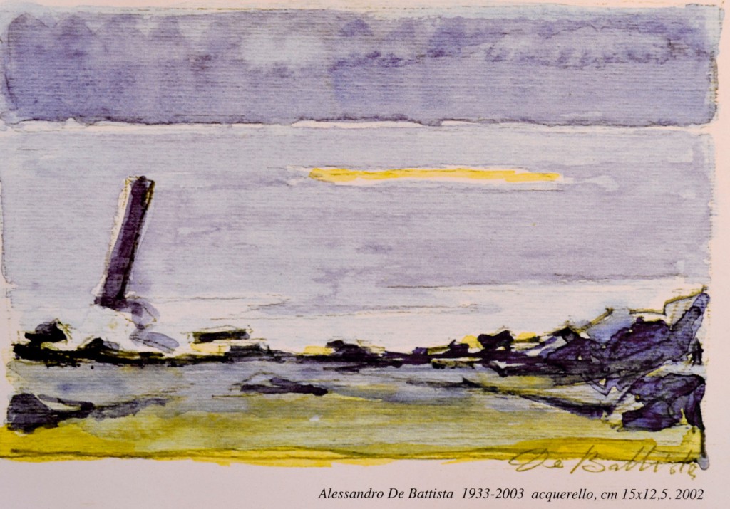 Non a caso Franco Necchi, che di De Battista era un amico prima ancora che un estimatore, descrivendo il suo percorso umano e pittorico ha scritto: “A Mandello, suo paese natale, Alessandro De Battista era “il pittore”. Ogni mattina, dalla piazza dell’imbarcadero, si attardava a contemplare l’immobile distesa del lago e le montagne che vi si riflettono. Sembrava volesse catturare le tonalità dei colori, ogni giorno diverse, per ricrearle poi nei suoi paesaggi d’acqua”.