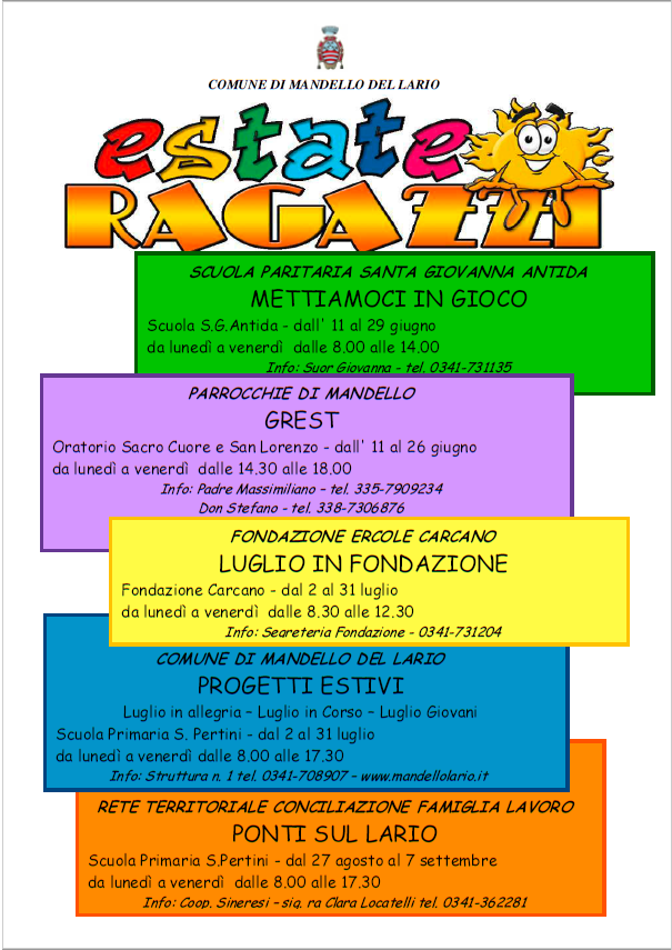 MANDELLO – Grandi novità per i servizi estivi riservati agli studenti mandellesi: le iniziative promosse dal Comune, le parrocchie del territorio, la fondazione Carcano , la scuola paritaria S.G. Antida permetteranno di coprire tutto il periodo delle vacanze scolastiche, ad esclusione delle quattro settimane di Agosto.