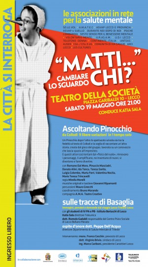 LECCO – Una serata per sensibilizzare la cittadinanza sul tema della salute mentale. In programma per questo sabato 19 maggio alle 21 presso il Teatro della Società di Piazza Garibaldi, l’iniziativa dal titolo “Matti…Chi?” vedrà alternarsi sul palco del Sociale uno spettacolo teatrale a cura dell’associazione Auto Mutuo Aiuto con l’ARTeatro (Amatec) e la presentazione del viaggio intrapreso da due classi dell’Istituto Bertacchi a Trieste, durante il quale gli studenti hanno potuto conoscere come lavorano i centri di salute mentale e il reparto di psichiatria della città di Franco Basaglia.