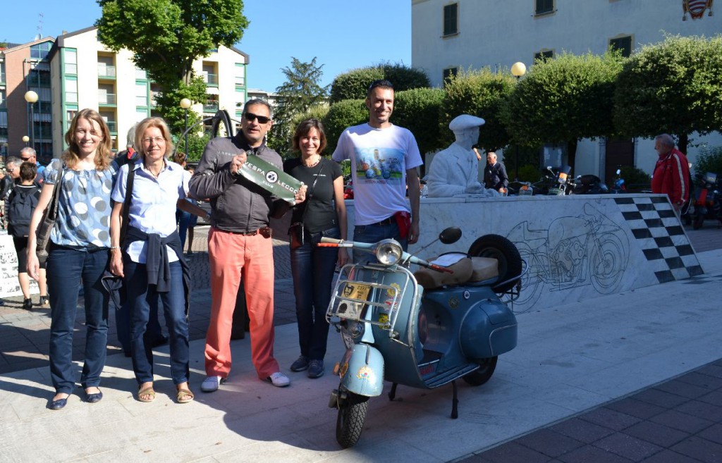 Oltre ottanta motociclisti, in larga prevalenza in sella a modelli di ieri e di oggi della Vespa, si sono dati appuntamento in piazza Leonardo da Vinci a Mandello per il primo atto di una giornata trascorsa appunto nel ricordo di Patrignani, che proprio in sella a una Vespa 150 effettuò nel 1964 il mitico raid Milano-Tokyo.