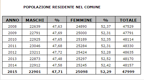 La popolazione è comunque cresciuta rispetto a quanto era stato riscontrato tra il 2008 e il 2009. Il picco demografico si è invece avuto nel 2012 quando i residenti nel capoluogo hanno toccato la soglia dei 48.635 abitanti.