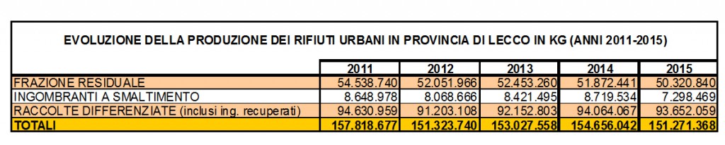 Nel lecchese la produzione di rifiuti urbani lo scorso anno è infatti cala di oltre 3 mila tonnellate (-2,2%) rispetto al 2014, attestandosi a 151.271 tonnellate. Si calcola mediamente nel 2015 che ogni abitante abbia prodotto 445,89 chili di spazzatura (erano 454,54 t nel 2014).